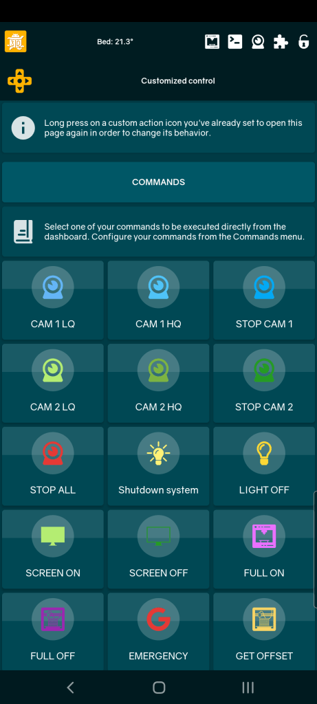 - One of your custom commands (GCODE, SSH, OctoPrint system, or HTTP request) = execute the command on click