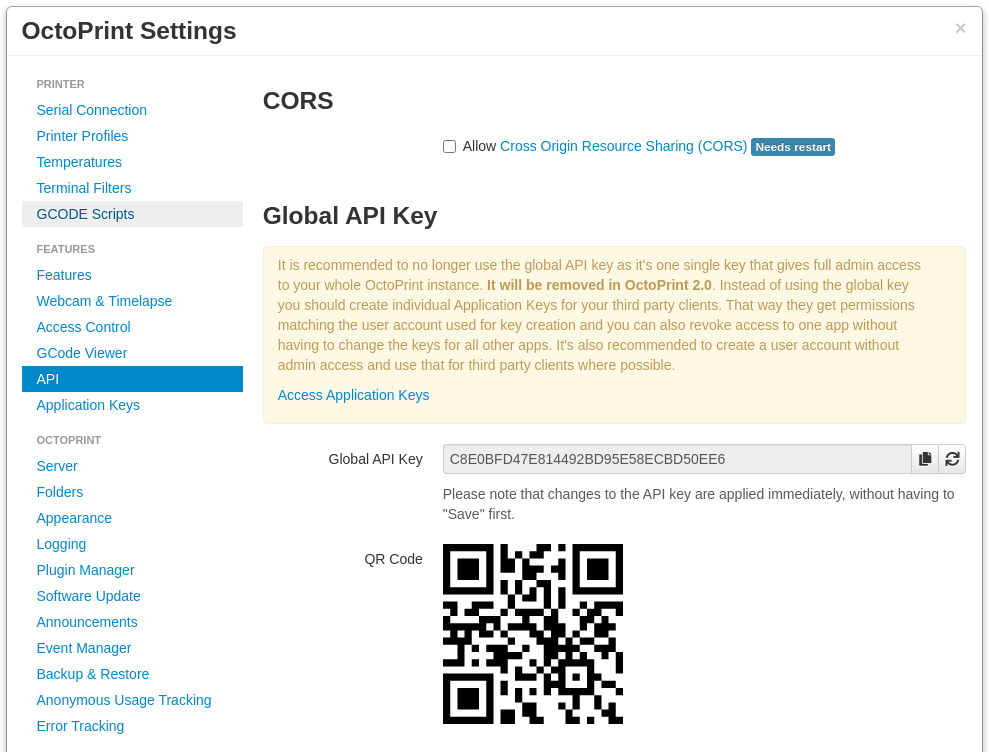 6. OctoPrint API key: from the OctoPrint web interface, it can be found under the Settings button (on the top right) then in the API menu. The Global API key can be used for your tests. (See Figure 1)